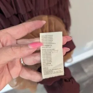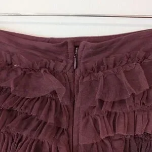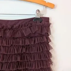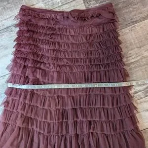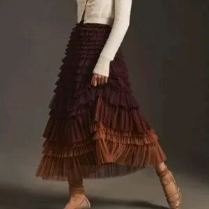 This stunning brown ombre maxi skirt from Anthropologie features a captivating cascading tiered design with ruffled layers of tule, perfect for a cocktail night out. Its A-line silhouette offers a flattering fit, while the voluminous tiers add a touch of drama and elegance. size medium. excellent pre-loved condition. measurements in photos.