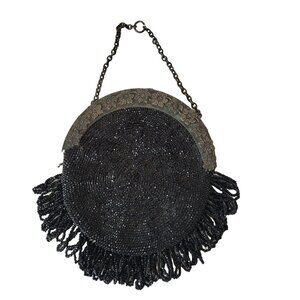 This antique black beaded purse exudes timeless charm. Featuring intricate bead work, fringe detailing, and a floral metal frame, it is a unique collector's item. The handbag has a soft leather doeskin interior and leather back with a metal embossed frame having trailing flowers. Clasp is missing, has chain with a center ring in the middle.