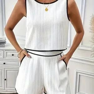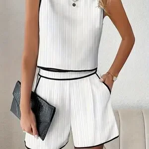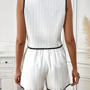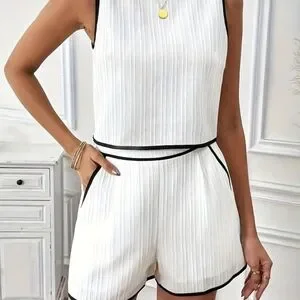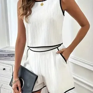 This stylish set combines a sleek white design with contrasting black piping for a modern edge. The textured fabric adds sophistication, while the fitted bodice and flared shorts create a flattering silhouette. Ideal for making a statement at any event.