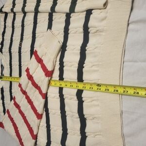 Tommy Hilfiger Golf oversized vintage cable knit striped cable knit striped sweater, size XL. Center mass is striped black, right arm is red, and the left arm is green. Slight stains as pictured, hardly noticeable. #golf #golfwear #golfclothes #lightacademia