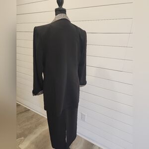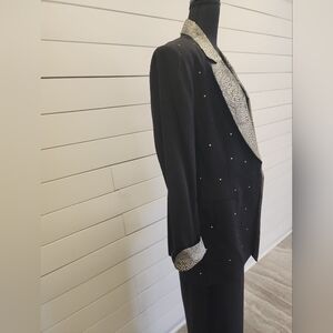 Elegant suit features a striking black design with shimmering silver sequins, perfect for formal events. The long sleeves and full-length silhouette offer a refined and timeless appeal