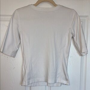 This top is way cuter than these pictures! This white/light ivory tee from Rebecca Taylor has a fitted silhouette and short sleeves, a class up version of a plain white T-shirt. Bodycon and very flattering! Works really well to dress up or dress down.