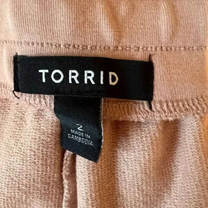 EUC Torrid dusty pink pull on high waist shorts. Elastic waist with drawstring. Large front patch pockets. French terry; cotton/spandex blend. No rips, tears or stains. Approximate measurements waist 17”, inseam 4.5”, rise 12”. Size 2. Please refer to Torrid size chart in photos. #athleisure #comfy #casual #weekend #spring