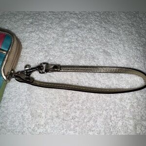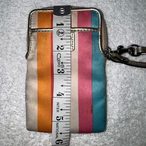 Pre-owned wristlet, with no holes no rips no odor, pet and smoke free home, very cute Coach, zipper works great, normal rubbing on the corners, and it may have some discoloration on the outside, inside is clean, PLEASE LOOK CLOSELY AT THE PICTURES IF YOU HAVE ANY QUESTIONS PLEASE LET ME KNOW, ALL REASONABLE OFFERS WILL BE ACCEPTED, thanks for looking.