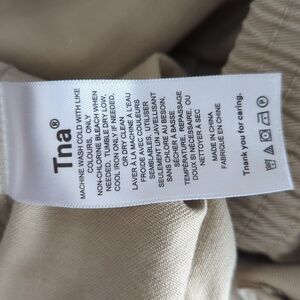 These are mid-rise pants with an elastic waist and inseam pockets. They’re made from canvas-like cotton twill.