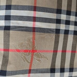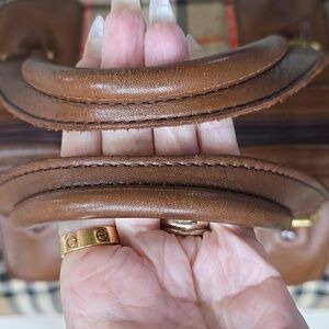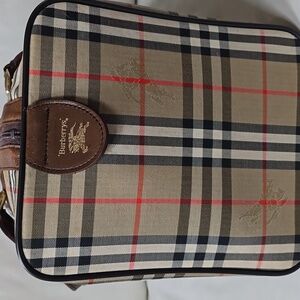 Stylish and sophisticated, this Burberry duffle bag features a classic tan and brown classic design with chestnut leather accents. It has 6 feet on the bottom for protection. Expresso leather piping all in excellent condition. Outside pocket for easy access with leather pull. Two wide sturdy handles that are in great shape. Leather around top zipper that adds to great look of this bag. Inside has hard piece on bottom and sides are leather inside. Outside fabric has classic Burberry plaid with knights all in the fabric repeat.This is a very rare bag in great condition. 18X8X10
