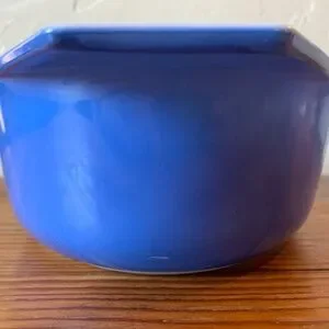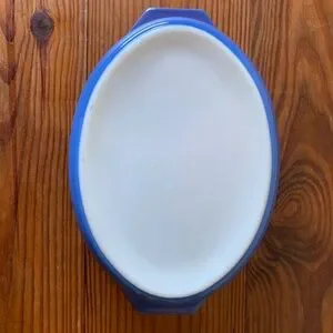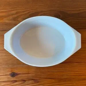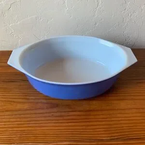 A classic piece of mid-century kitchenware, this vintage Pyrex casserole dish features a rich blue exterior contrasted with a bright white milk glass interior. Its timeless oval shape and tab handles make it both beautiful and functional—ideal for baking, serving, or displaying in your curated vintage kitchen. A versatile collectible that adds a vibrant pop of color and charm to any space.