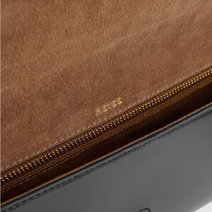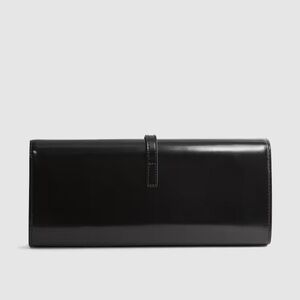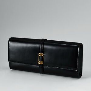 Elegant black clutch with a sleek design. Features a gold accent buckle. Perfect for evening events.