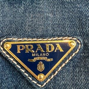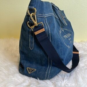 Elevate your style with this chic Prada denim tote bag. Featuring a classic blue hue, this bag is perfect for any occasion. Enjoy the luxury and craftsmanship of Prada in a versatile design.