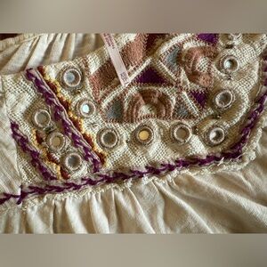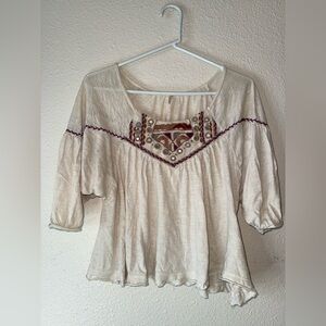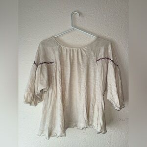 FREE PEOPLE Ivory 3/4 Balloon Sleeve Boho Embroidered raw hem peasant top