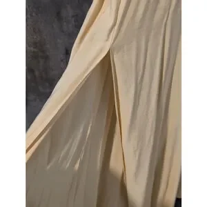This is an ASOS DESIGN Tall dress, size US 6 / UK 10 / EU 38. The dress is a light beige color and appears to be made of a soft, flowing fabric. It features a round neckline, short sleeves, and a fitted bodice that transitions into a floor-length skirt with a side slit. The back has a criss-cross strap design. The dress is new without tags or box.