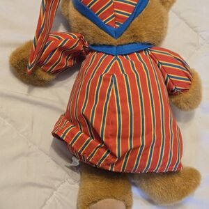 Cuddle up with this adorable teddy bear dressed in colorful striped pajamas. Perfect for kids, this plush toy is soft and huggable, featuring vibrant red and blue stripes. A delightful addition to any child's toy collection.