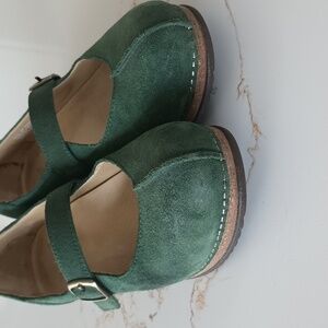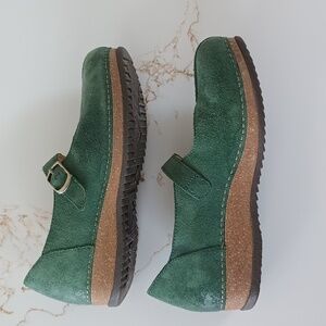 Dansko Mika burnished suede shoes in pine green. Mary Jane style. Size 38. There are a few spots on the interior footbed, but otherwise in excellent condition as shown. Easy to dress up or down. Cork and suede with exposed metal stapling detail around the edges.