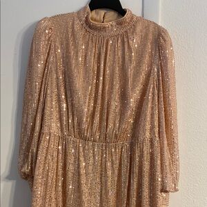 Shine in this stunning gold sequin dress. Perfect for any special occasion. Belt is detachable. Dress Length is 50 inches, sleeve length is 21 inches long, and bust measurement is 18 inches across. Waist measurement is 18 inches across. From pet and smoke free home. Only worn once!