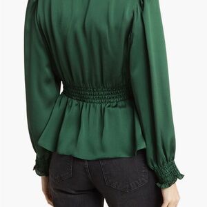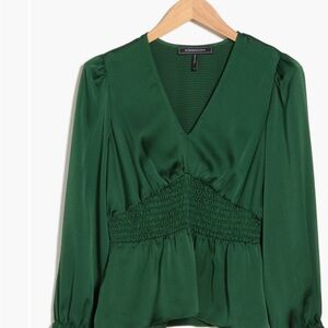 This elegant green blouse features a flattering V-neck and stylish smocked detailing. Perfect for any occasion.
