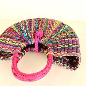 Handwoven purse, Peruvian origin, made from natural fibers. It features a circular handle and a unique half-moon shape. These types of bags are handwoven using techniques passed down through generations, often resulting in one-of-a-kind pieces. The purse is sustainably produced, reflecting a commitment to environmental consciousness and traditional craftsmanship.