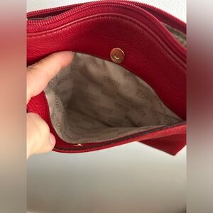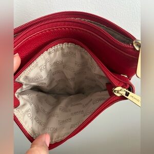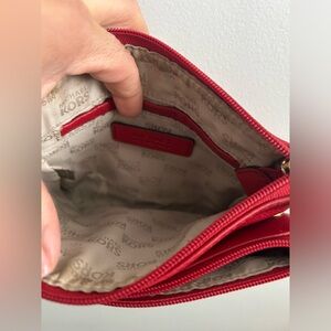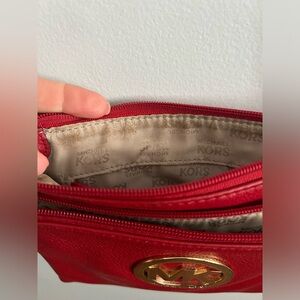 Michael Kors Leather Red Crossbody Purse. Stylish and compact, this Michael Kors red crossbody bag is perfect for traveling, vacation, cruise, shopping, festivals, for any occasion. Featuring a bold red color and signature MK logo. With compartments and adjustable straps.