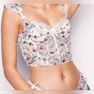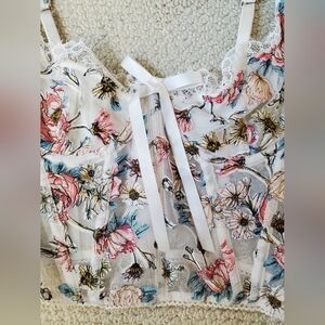 Excellent condition, this showstopper is sold out online, corset top with pastel floral embellishments adjustable straps back zipper underwire cups in extra small but please look at photos for measurements. tag in back is missing note photograph depicting such.