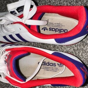 Adidas Superstar sneakers in white with purple stripes and red accents. Classic design with lace-up closure.