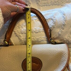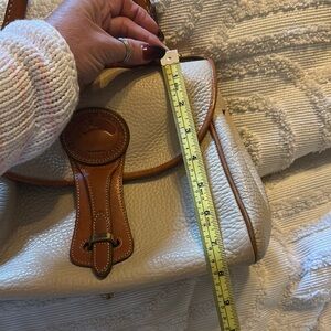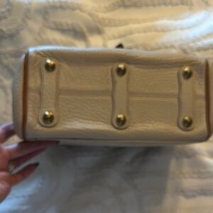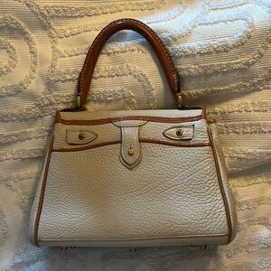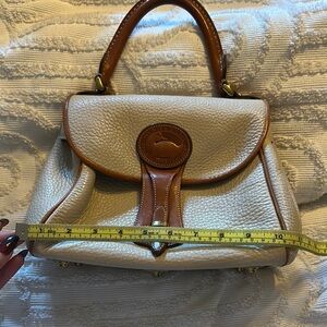 Discover elegance with this cream and brown leather Dooney Bourke handbag. Perfect for any occasion, this stylish accessory complements your wardrobe effortlessly. Bag offer small outside rear pocket and front leather side closure, inside one zip pocket and two open pockets and one snap pocket. Very good used vintage condition