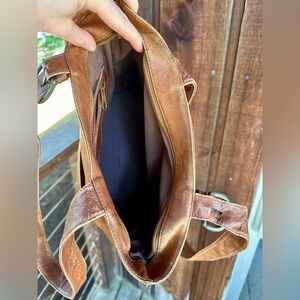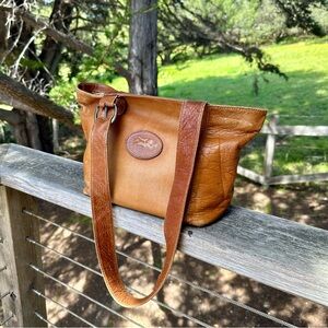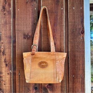 A stunning vintage leather purse with a classic and functional design. Made by American Angel, in luxe buttery soft caramel leather, with a simple tote design with multiple pockets. Nice size for an everyday bag. I love the shape of this purse and the American Angel logo and zippers are so charming.