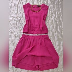 pretty Kourt hot pink linen blend skort set. blouson style sleeveless top, and flirty skirt with a wide stretchy waistband. tiny spot on the front of the top, as shown in the photo, otherwise excellent condition, size small. perfect summer ensemble.