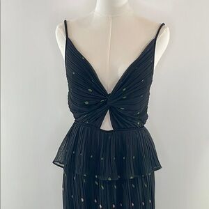 Elegant black gown by Sabina Musáyev with striking cutouts, a peplum waistline, pleated skirt and a vibrant floral hem offering a flattering fit with its unique cut and style. Made in Israel.
