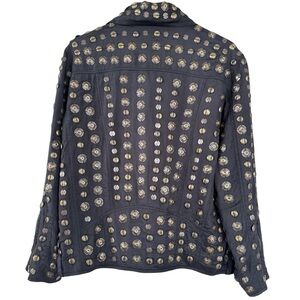 Taking the moto jacket to the next level, this soft, slouchy version is featured in an oversized, relaxed fit with exaggerated metal coin detailing throughout for an effortlessly edgy style.