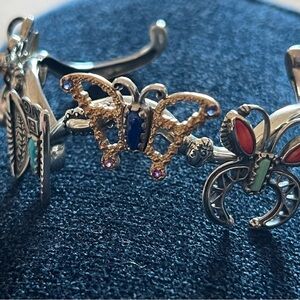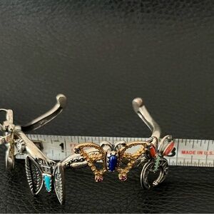 Sterling silver with semiprecious gem stones cuff featuring butterfly and insect designs. Accented with vibrant blue, red, and gold tones for a unique look. Makes you feel happy when you are wearing!