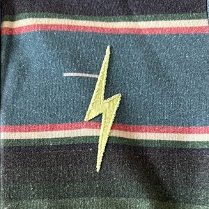 Vibrant striped hoodie with a zip-up front. Features a lightning bolt design. Perfect for casual wear