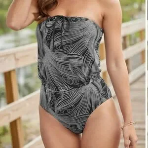 This sophisticated one-piece swimsuit showcases a striking black and white tropical leaf pattern, offering a stylish and cohesive look. The strapless bandeau design adds a touch of elegance, making it perfect for a fashionable day by the water. The tie in the front is functional and has a padded bust. Very slimming.