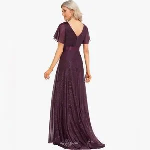 Step out in style with this elegant purple evening gown with a slight train. Perfect for any special occasion and flattering to most any body type.
