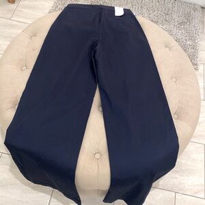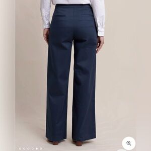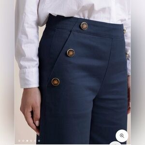 Make your sailing style dreams a reality with this navy Thalia wide-leg Sailor pant. Featuring side-slash pockets, an eye-catching wide-leg design, and an anchor-themed button detailing for a nautical touch. The zipper can be found hidden along the side, and the back welt pockets add to the structured effect. Cotton material with a hint of stretch makes these pants a comfortable option for all-day wear. Measurements - waist 14 inches, length 41 inches, inseam 32 inches. Measurements made lying flat and are approximate. NWT