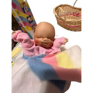 This vintage hand puppet is a collectible piece from 1984, featuring a soft baby design with a cozy blanket in a woven basket bed.
