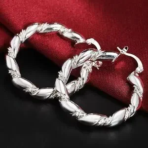 These silver hoop earrings feature a unique twisted design that adds texture and elegance. The polished finish enhances their reflective quality, making them a standout accessory. The hinged closure ensures easy wear and secure fit.