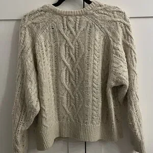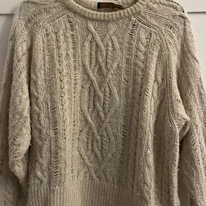 Cozy and stylish cream-colored cable-knit sweater featuring a detailed open-knit pattern with braided accents. This classic pullover is perfect for layering in colder seasons, adding a chic and timeless touch to any outfit.