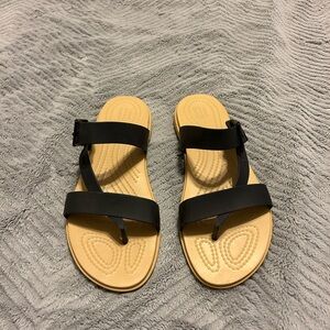 Stylish and comfortable black strappy sandals with a comfortable tan sole. Worn 2x, still in new condition.