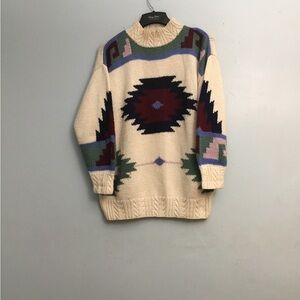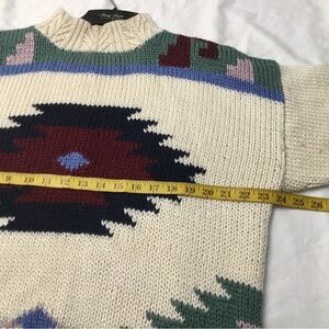 Cozy knit sweater by Outback Red. Features a classic cream color. This sweater is vintage. These is a small discoloration on the neck. It was purchased like that. It isn’t stained. Multicolored