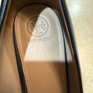 These Tory Burch heels feature a sleek black design with a high, thin heel and a rounded toe. The standout gold-toned emblem on the toe adds a touch of elegance, making them perfect for formal occasions. Crafted with a smooth finish, these heels offer a timeless and sophisticated look.