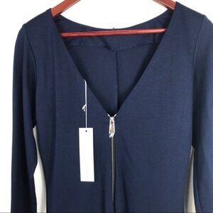 with boat neck, long sleeves, and zipper up the back. Navy blue color, Deep V at back.