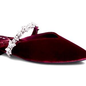 Our statement making pointed-toe mule is crafted of soft gray velvet and adorned with a crystal strap for added opulence. We covered our footbeds with a lustrous satin lining for added luxury and comfort.