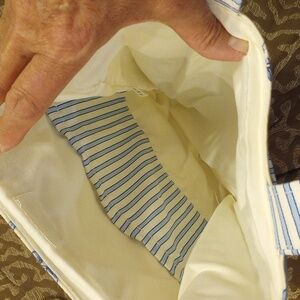 Baby tote bag with blue and white patterns in vintage scenery. Features playful illustrations and striped design. Great for church to carry snacks or children's books .