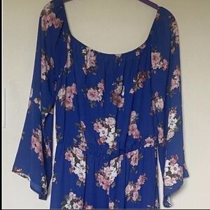 Altered State royal blue off shoulder maxi dress, pink floral, bell sleeves front ties elastic waist and slits on bottom both sides