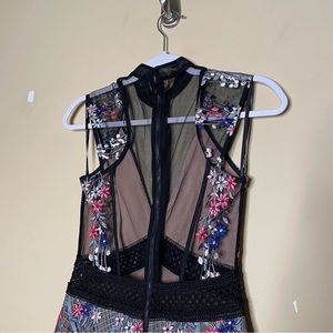 * Details: back zipper closure, mesh detailing, cap sleeves, lined, tiered ruffle