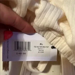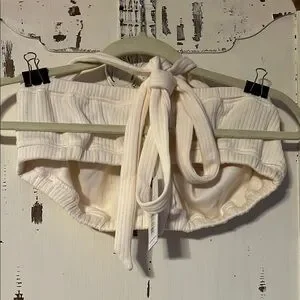 This cream crop halter tie bra top by WeWoreWhat is crafted from a soft, textured fabric that provides both comfort and style. The elastic waistband offers a secure and flexible fit, making it ideal for casual wear. Its subtle texture adds a chic element to any outfit. MSRP $49 NWT