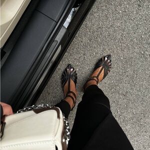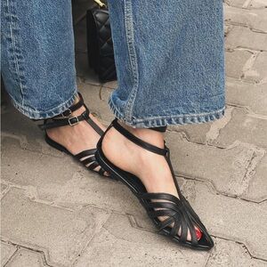 These black sandals feature a sleek slingback design with a cage-like pattern of thin straps over the toes, offering a minimalist and elegant look. Crafted from genuine leather , they provide a comfortable fit with a thin, flexible sole. Ideal for casual outings, these sandals combine style and comfort effortlessly.