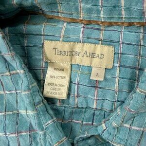 The Territory Ahead Sz L Teal with multicolored threads Green Geometric Print Short Sleeve Button Front Shirt is a stylish and versatile addition to any man's wardrobe. Made from comfortable cotton material, this shirt features a colorful geometric print that adds a pop of personality to your casual outfit. With a collared neckline, button closure, and curved hem accents, this shirt is perfect for all seasons and occasions. The regular fit and easy care instructions make it a practical choice for everyday wear, while the branded Territory Ahead design adds a touch of classic style. Perfect for summer, fall, or spring, this shirt is a must-have for the modern man.