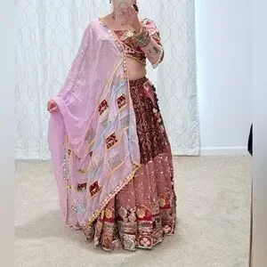 This exquisite lehenga showcases a harmonious blend of pink and red hues, adorned with intricate embroidery that adds a touch of elegance. Perfect for festive occasions, it combines traditional craftsmanship with a modern flair. The lehenga's luxurious fabric and detailed design make it a standout choice for any celebration.