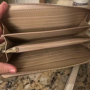 This elegant Coach wristlet features a beautiful floral design on a beige background. Perfect for adding a touch of sophistication to any outfit.