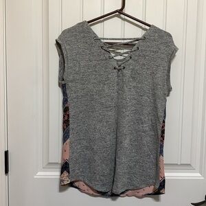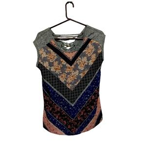 MAURICES WOMENS SHORT SLEEVE PATCHWORK TOP SHEAR FRONT CRISS CROSS BACK SMALL